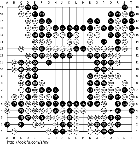 1d ;)Alife361 [?]: h6MidNReaper [1d]: nothing to do with ranks really since its so hard to prove which move is correctcarlcarl: n10?Javaness [2d]: G13];W[qc]C[tobe30k [1d]: all wrongMidNReaper [1d]: looks like there will be huge moyo for bimagine [3k]: r17 wrong maybe];B[pc]C[DonGroucho [13k]: T20matjet2 [?]: should white have attempted to spoil blacks center before invading the corner?poivron [-]: r17 seems wrong imoh];W[qd];B[qe];W[re]C[MidNReaper [1d]: s14Minutemade [9k]: k10 for the win];B[pe];W[rf]C[imagine [3k]: p13fjiel [1d]: ^^poivron [-]: p12eurogotv [-]: n11MidNReaper [1d]: n11 or n12Minutemade [9k]: p12 looks nice o.otobe30k [1d]: o12 tobe30k [1d]: :)piku [2k?]: o12Alife361 [?]: r7MidNReaper [1d]: o12?Javaness [2d]: F14];B[pn]C[MidNReaper [1d]: cant decideeurogotv [-]: what???];W[on]C[Alife361 [?]: Almost like r7!eurogotv [-]: terrible move];B[ni]C[Javaness [2d]: betterProdigious [4d]: tactical forcing movecarlcarl: niceMidNReaper [1d]: q6 looks terribleAlife361 [?]: r7 was bad?Javaness [2d]: *\o/* Go Laura-Lucian *\o/*eurogotv [-]: q6 worst move of thew game];W[he]C[MidNReaper [1d]: agreedunikoline [2k]: yesJavaness [2d]: I think it was useful];B[ge]C[GenVital [2k]: why its so bad?eurogotv [-]: no more p6tobe30k [1d]: ya, why?unikoline [2k]: ???eurogotv [-]: p6 killed p3MidNReaper [1d]: eliminates the aji there was in whites shapenewton [1k]: it gives nothing for black, strengenth white and makes the black wall weakerHendrix [1k]: H15 a bit optimistic?MidNReaper [1d]: yes weakens b too on centerAlife361 [?]: That's why i'd propose r7. imagine [3k]: g14?MaxMakinen [3k]: its pairgo... q6 might have been a forcing move to let the partner pay the next move...];W[gd]C[MaxMakinen [3k]: *playMidNReaper [1d]: that would be a horrible plan, you cant play plain bad moves intentionallydjrrjddjrd [10k]: g14Prodigious [4d]: q6 really wasn't as terrible as you're making it out to bescurge [5d]: g15 pretty bad, before black was lot ahead now hard to sayProdigious [4d]: lost some aji, sureMaxMakinen [3k]: well, its quite common in pargo to just use some sente to let your partner play.. specially if the partner is stronger and you dont know what to doProdigious [4d]: but not the end of the worldpinpingho [-]: in fact it isn't that badEPGC2010 [-]: b ten minutes leftdjrrjddjrd [10k]: g14!!!!!!!!!!!!!!!!!!!!!!!!!!!!!!];B[hd]C[Minutemade [9k]: so q6 was like a pass? o.oMidNReaper [1d]: nopinpingho [-]: can't even really say b will lose anything out of that movedjrrjddjrd [10k]: black lost the game carlcarl: ........MidNReaper [1d]: its just a general mistake to eliminate aji for no reasontobe30k [1d]: but he has the centerKatsuri [?]: not yetMinutemade [9k]: isnt black ahead alot? ><];W[gf];B[fe];W[ff]C[MaxMakinen [3k]: midnreaper.. yes, it is.. but there is a reason if you're using it as a pass ;) not saying thats what happened.. just that its possiblecarlcarl: b ???Javaness [2d]: white entered the moyo in sente];B[gc]C[pinpingho [-]: b's play is weird hereJavaness [2d]: disasterMidNReaper [1d]: bye bye moyounikoline [2k]: oh....Javaness [2d]: I blame LucianHendrix [1k]: H12=honku [1d]: W 'enters the dragon' ^_^];W[gn]C[Alife361 [?]: h7Ananda [4k]: p13 carlcarl: dragon fly~];B[hm]C[Alife361 [?]: +MidNReaper [1d]: so w has about 60 points atm?MidNReaper [1d]: b has...Minutemade [9k]: SE brokeMinutemade [9k]: :P];W[fl]C[Kmar [1d]: outchcarlcarl: : )Hendrix [1k]: nice move! :) .. now H6 will hurtJavaness [2d]: ai ai aiAlife361 [?]: B needs 25 point int center to drawAlife361 [?]: in*djrrjddjrd [10k]: f9MidNReaper [1d]: i doubt he gets even 20 after this attackdjrrjddjrd [10k]: 黑下的真烂carlcarl: lol];B[fm]C[newton [1k]: f9 is badscurge [5d]: only option is to sacrifice all i thinknewton [1k]: f9 e8Javaness [2d]: kill all];W[em]C[Minutemade [9k]: i dont see it o.odjrrjddjrd [10k]: f9 is bad?norgkost [5k]: can black sacrifice the 4 stones?djrrjddjrd [10k]: now white in the centerMinutemade [9k]: i dont think the four die o.o];B[el]C[MidNReaper [1d]: this wont be prettyscurge [5d]: now its over propaply :( but still black will fight ;scurge [5d]: )newton [1k]: f9 e8 ... white has a bamboo and threatens the 4 stones ... black has nothing];W[ao]C[norgkost [5k]: a5 gote?MidNReaper [1d]: ? what is thisMaxMakinen [3k]: might yet again be a forcing move to let the partner play...piku [2k?]: niceAlife361 [?]: Next will be s7. Whites will have enough :)];B[go]C[piku [2k?]: heheAnanda [4k]: an eye for an eye :)just9x9 [-]: b forces back?pel [2k]: schmerze];W[fp];B[fo];W[eo]C[DonGroucho [13k]: pel arent you that guy that played that teaching game with that guy on that day?Wormhole1: lol?barty [1d]: h4 matjet2 [?]: no he's that other guyjust9x9 [-]: when 13k's talk?honku [1d]: but W has J2 anywaybarty [1d]: yeap trueMidNReaper [1d]: h4 = stupidbarty [1d]: maybe better just h6DonGroucho [13k]: that should be a horror movie, When 13k's Talk.carlcarl: b not alive yetjust9x9 [-]: why does b play this line? forcing moves that end in gote or loose points?EPGC2010 [-]: b last minuteMocramis [3k]: carlcarl neither whitejust9x9 [-]: or is he out for a kill seriously there?MidNReaper [1d]: finally they have to start playing instead thinkingmatjet2 [?]: timesujis?carlcarl: so i think b won't try to kill 0.0Alife361 [?]: Now h6 and a3 are miai for whites?];B[hn];W[ap]C[Alife361 [?]: a4 sorry :)Ananda [4k]: sacrifice the corner ?];B[dq]C[matjet2 [?]: why not d3 instead of h6?];W[ep]C[ledeiR [2d?]: a3 would give a ko for bdenisda [5k]: semeai];B[hh]C[djrrjddjrd [10k]: white win!!!!!!!!!!!!!!!!!!!!!!!!denisda [5k]: but white has more lib.kurizu [6k]: white winning semeai Mocramis [3k]: that's a huge sacrificedenisda [5k]: yeah...kurizu [6k]: p13 seams bigMidNReaper [1d]: how much is w left side nowcarlcarl: b g5 is boringdenisda [5k]: but they take the cornerpiku [2k?]: intelligent sacrificedenisda [5k]: the centerpiku [2k?]: :Ddenisda [5k]: sorryMidNReaper [1d]: 60 points?honku [1d]: B goodhonku [1d]: W has around 90, 